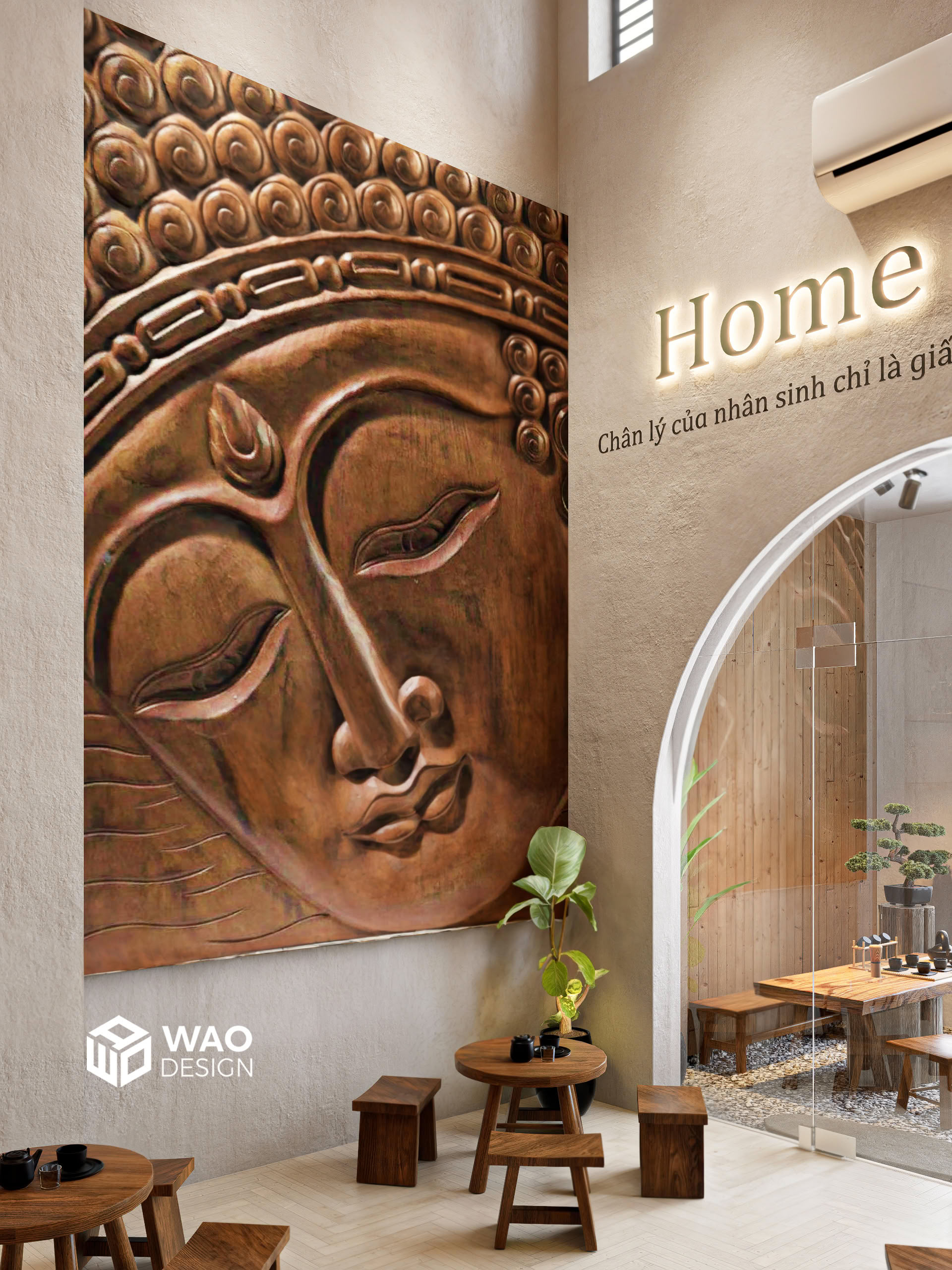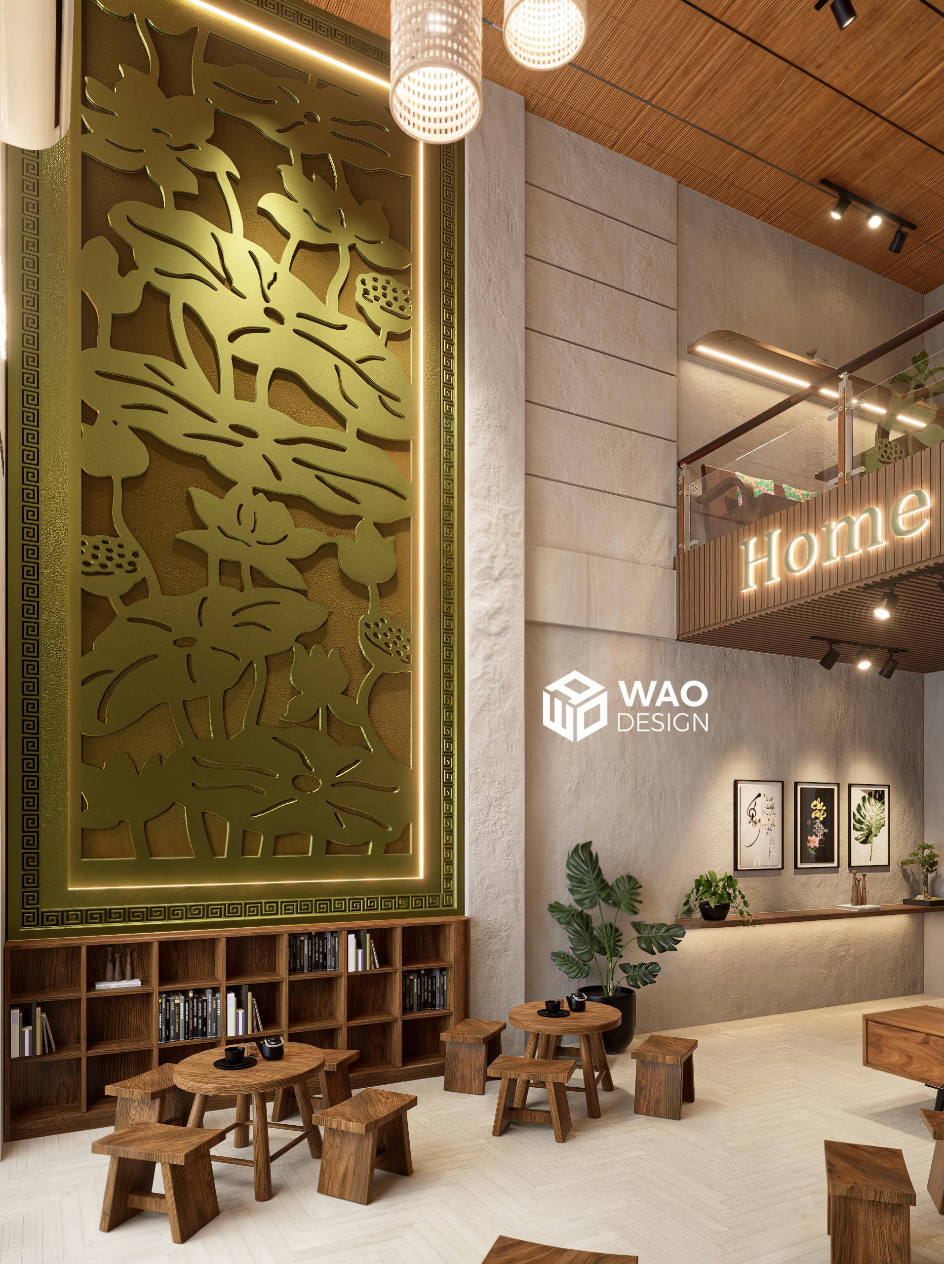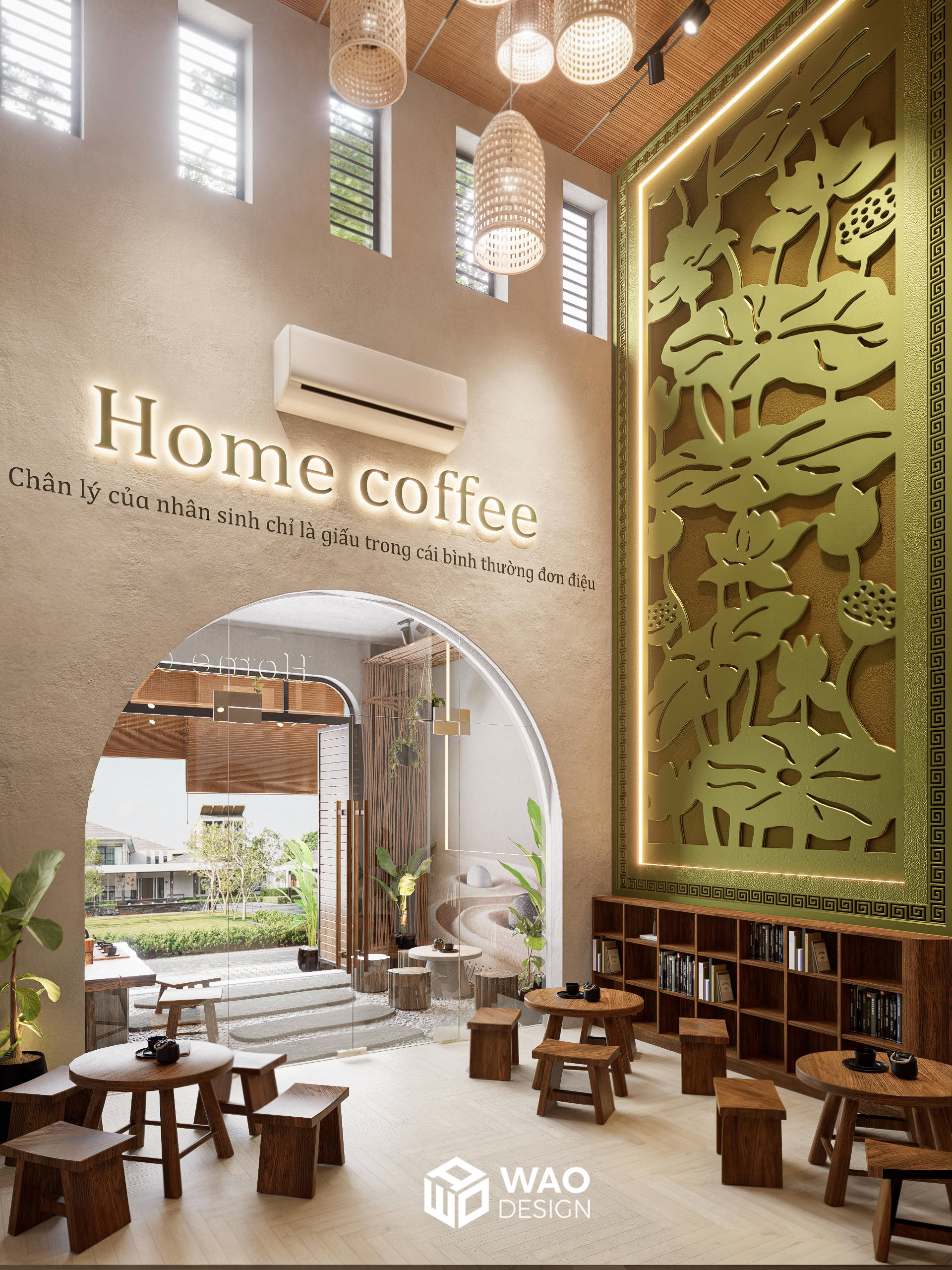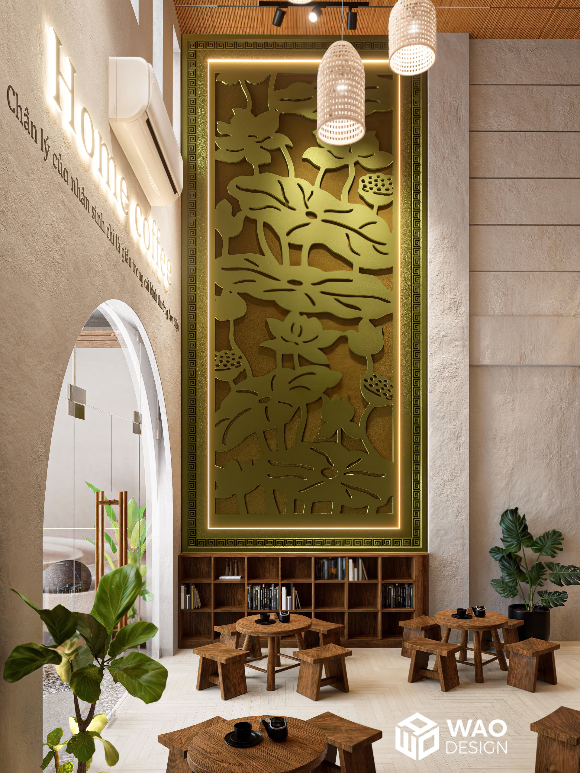 With the desire to create a tranquil, Zen-inspired café space — rustic yet truly Vietnamese, while still aligned with feng shui and the owner’s personal taste. Home Coffee is designed with earthy tones and natural wood materials, bringing a sense of warmth, calm, and peace. It carries a subtle Buddhist spirit, yet remains modern and inviting.