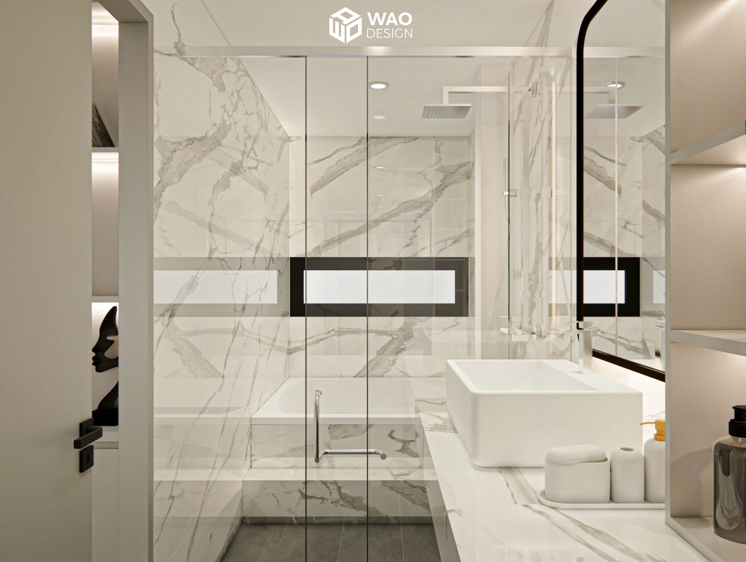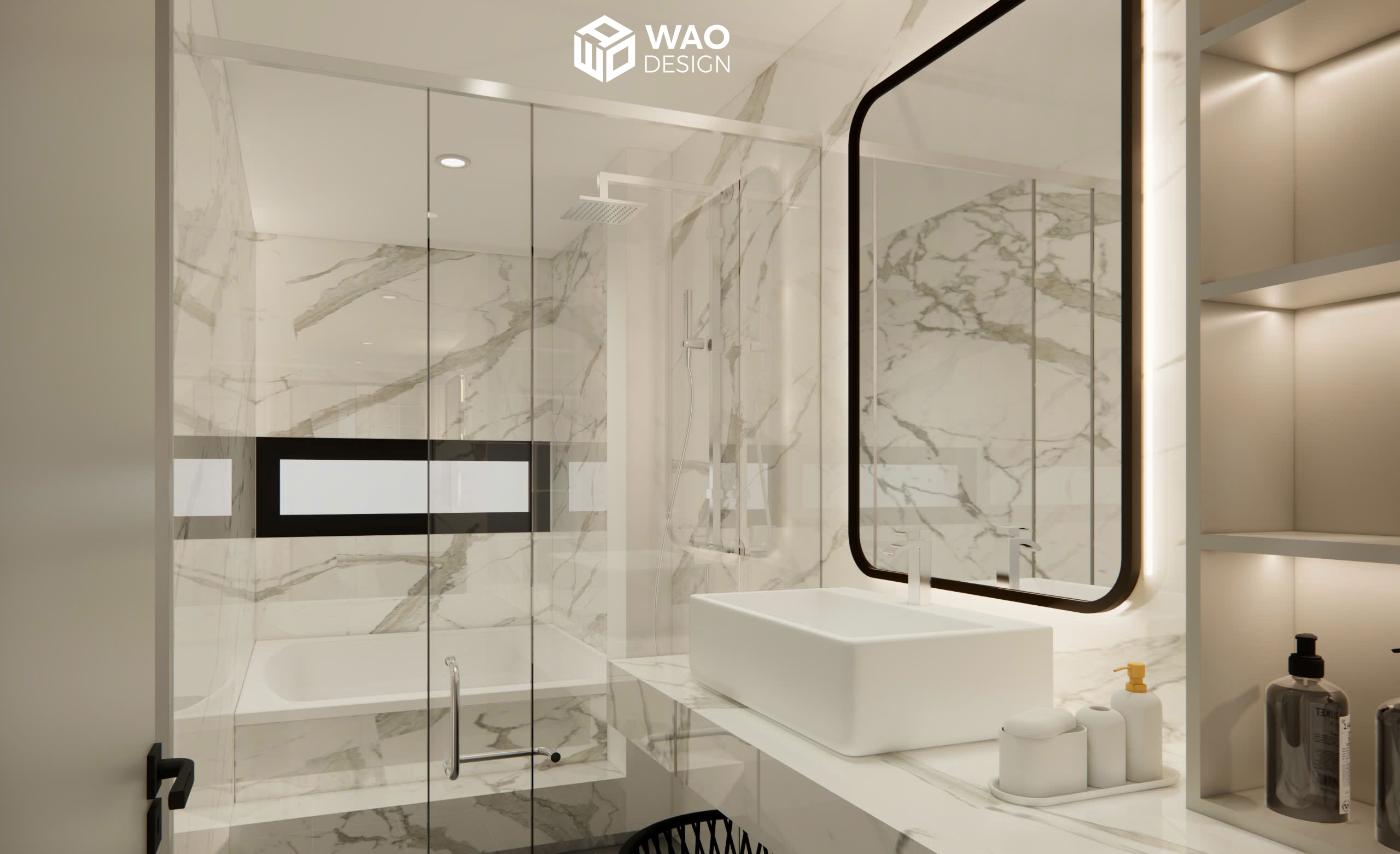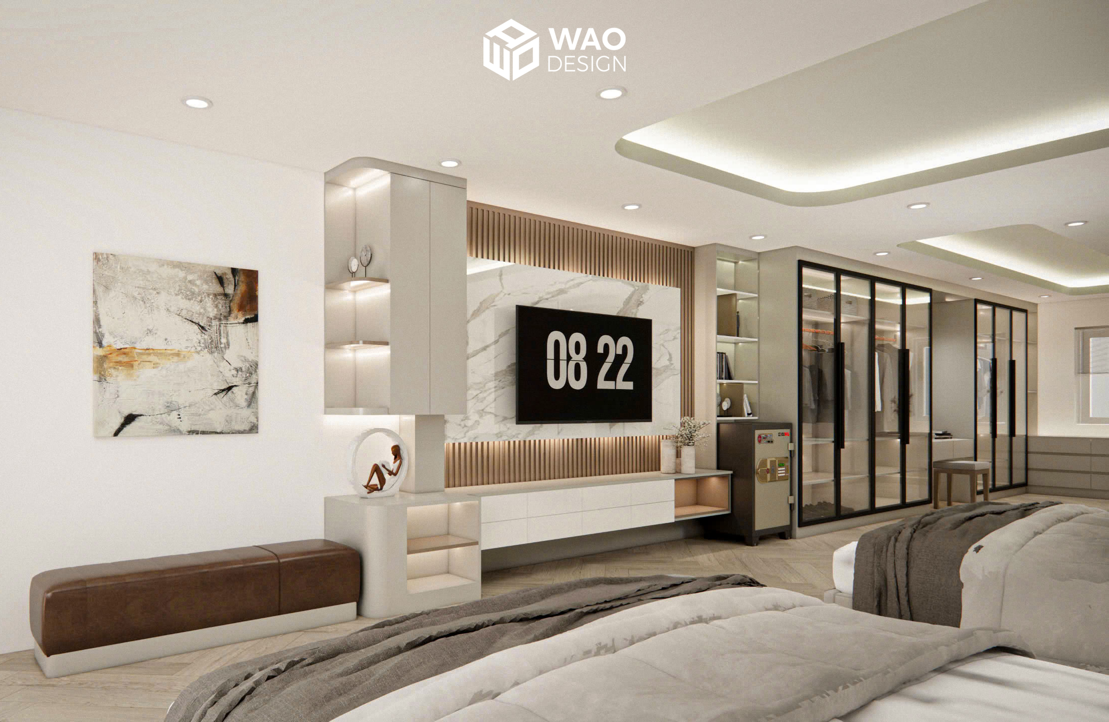 A high-class design that combines a bedroom for the parents and their 4-year-old son. The room is arranged in a modern layout with warm tones, bringing both elegance and comfort. Equipped with all the functions of a luxury hotel suite — including a closet area, work desk, king-size bed, bathtub, and an 85-inch TV — it offers the owners absolute comfort.