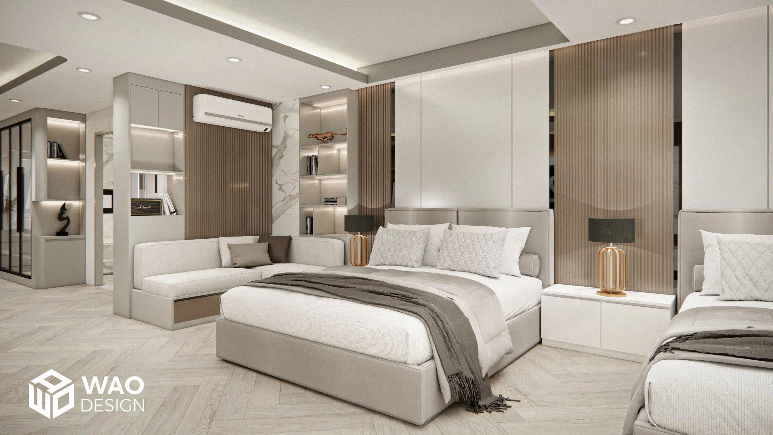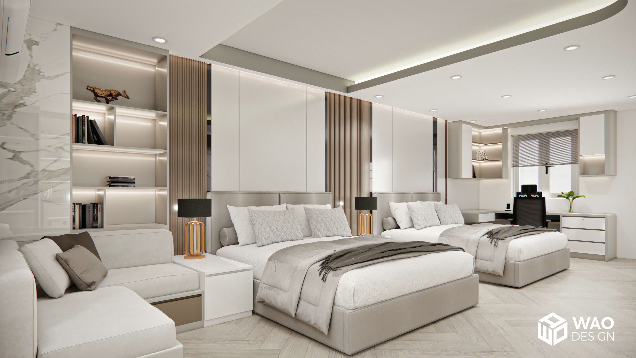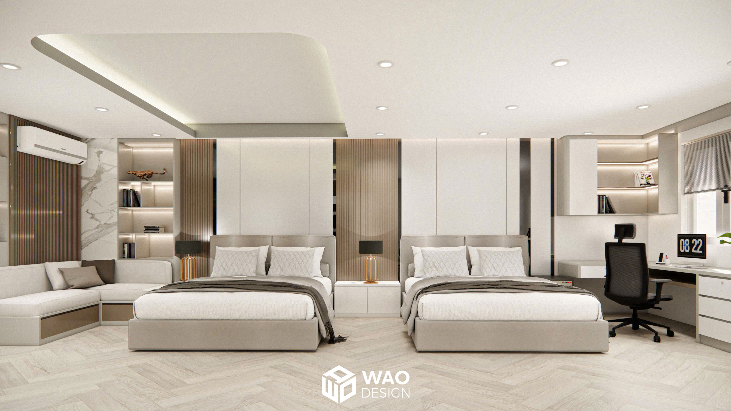 Một thiết kế đẳng cấp kết hợp phòng ngủ cho bố mẹ và cậu bé nhỏ 4 tuổi. Căn phòng được bố trí hiện đại với tone màu ấm, hiện đại và sang trọng. Với không gian được trang bị đầy đủ các chức năng cho 1 phòng ngủ tiêu chuẩn khách sạn hạng sang với đầy đủ khu closet, bàn làm việc, giường ngủ kingsize, bồn tắm, tivi 85 inch … mang lại sự thoải mái tuyệt đối cho gia chủ.