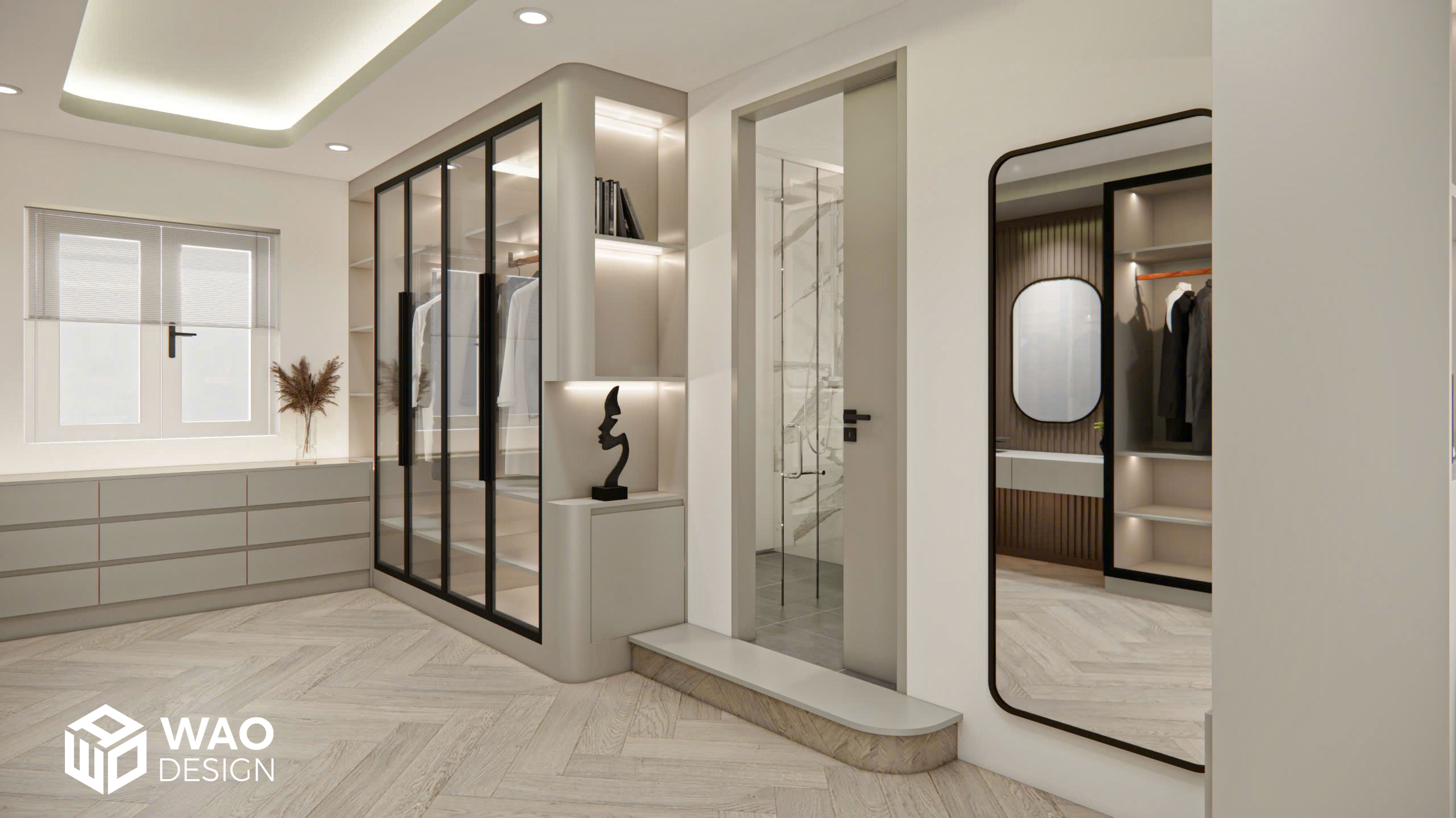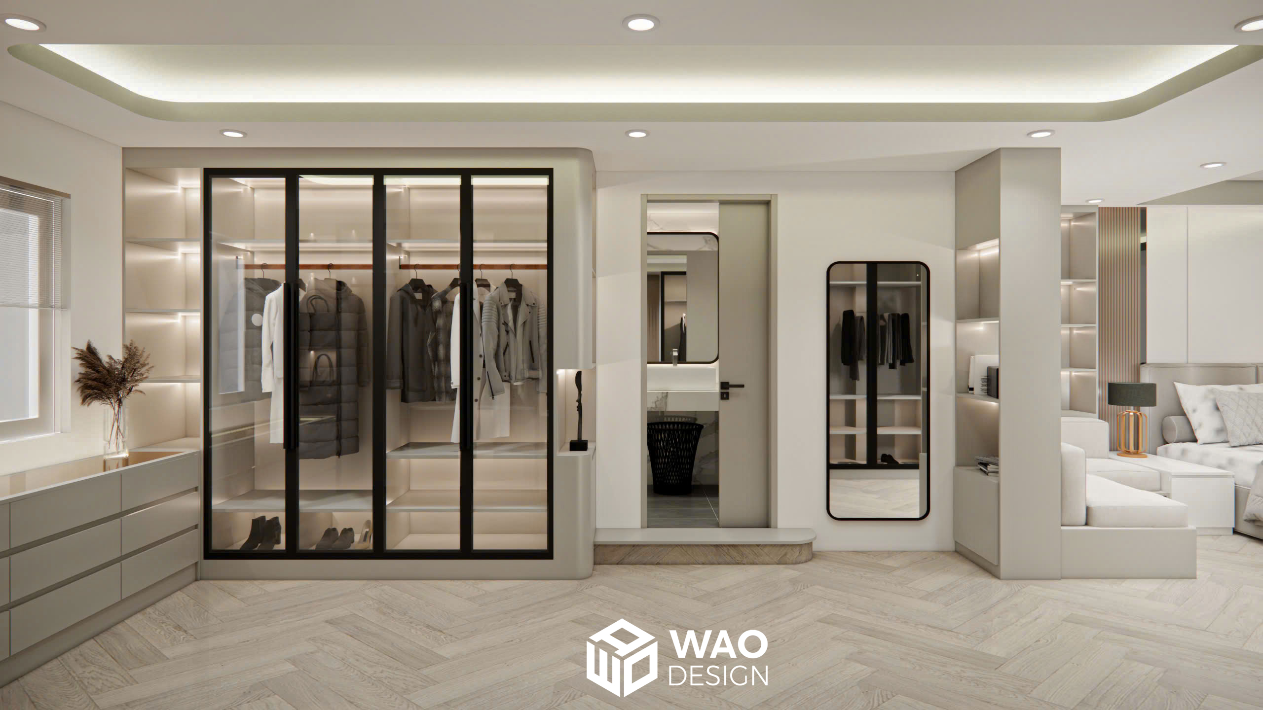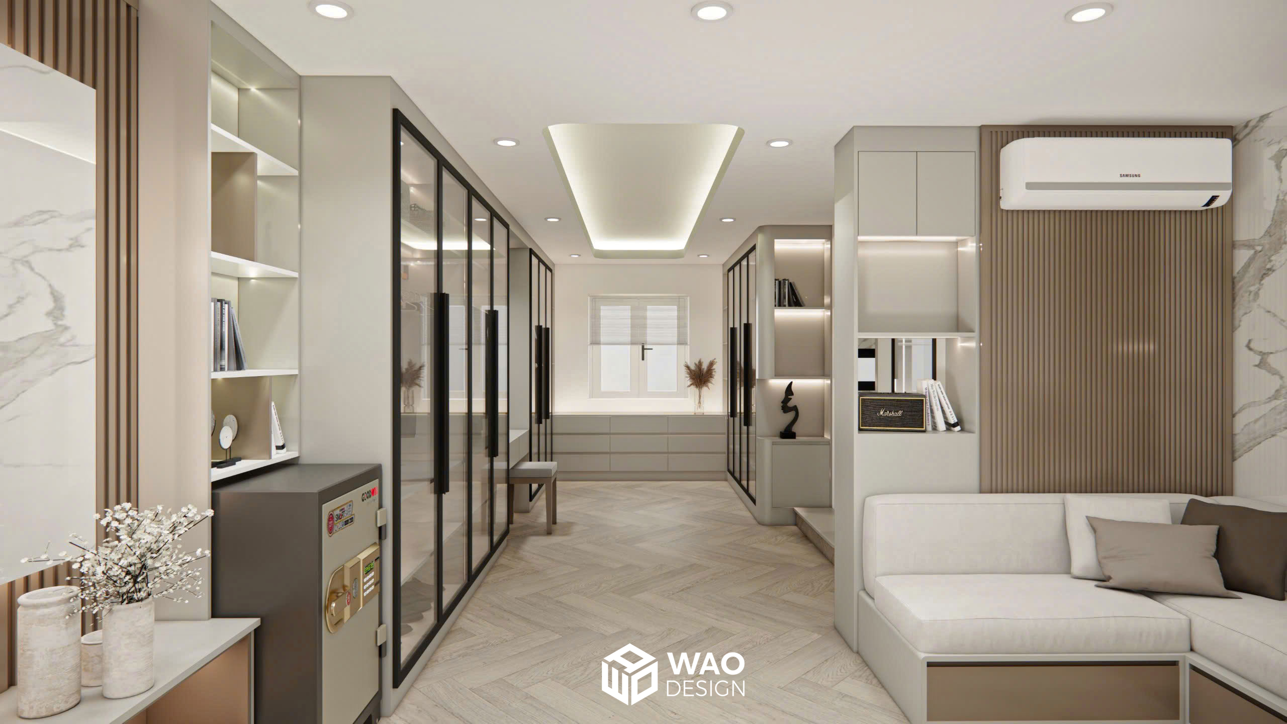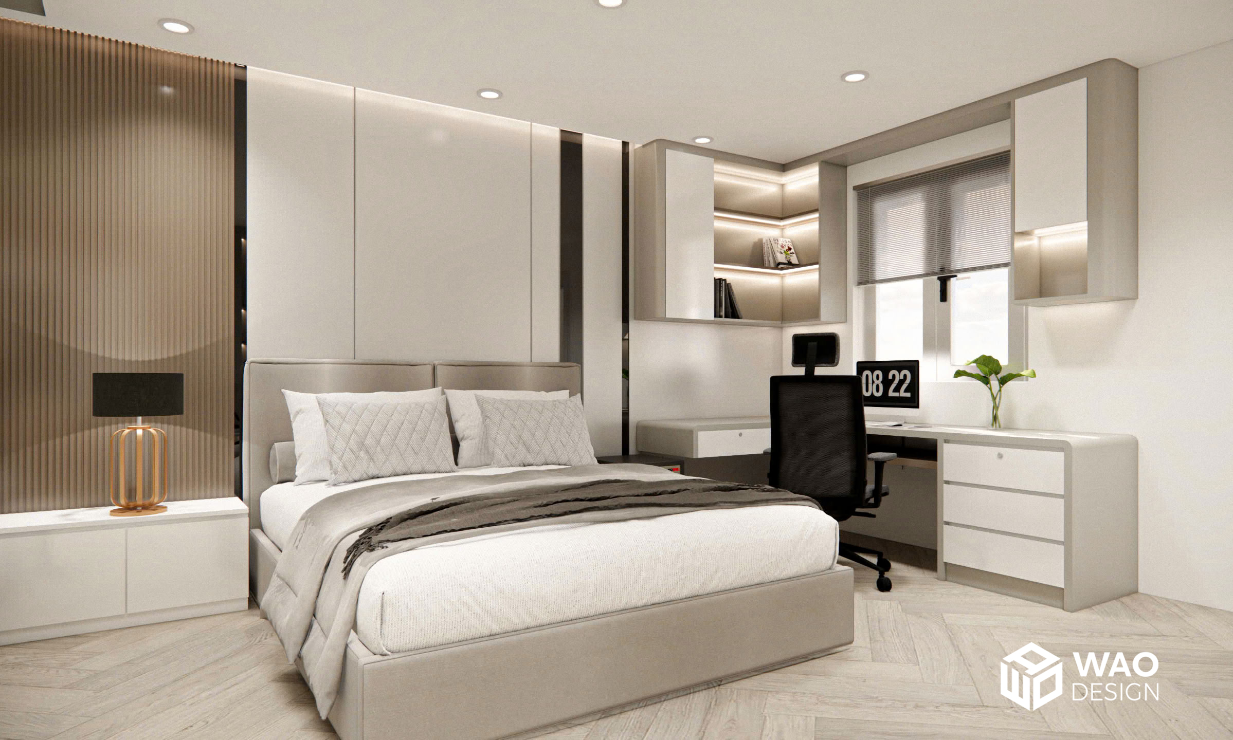 Một thiết kế đẳng cấp kết hợp phòng ngủ cho bố mẹ và cậu bé nhỏ 4 tuổi. Căn phòng được bố trí hiện đại với tone màu ấm, hiện đại và sang trọng. Với không gian được trang bị đầy đủ các chức năng cho 1 phòng ngủ tiêu chuẩn khách sạn hạng sang với đầy đủ khu closet, bàn làm việc, giường ngủ kingsize, bồn tắm, tivi 85 inch … mang lại sự thoải mái tuyệt đối cho gia chủ.